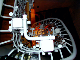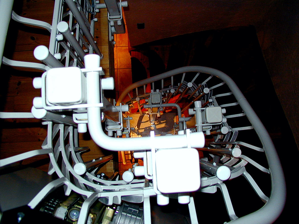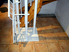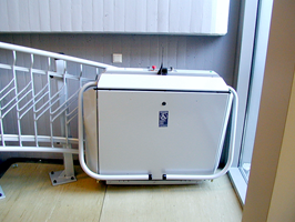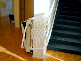 Treppenlift in einem Privathaus. Nachträglich an eine bestehende, enge Wendeltreppe angepasst.