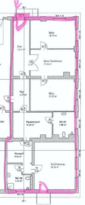 Die Räume werden momentan als Büros genutzt. Das Gebäude wurde Anfang der 90er Jahre saniert. Die Räume sind renovierungsbedürftig. Dies kann durch den Mieter oder Vermieter realisiert werden.